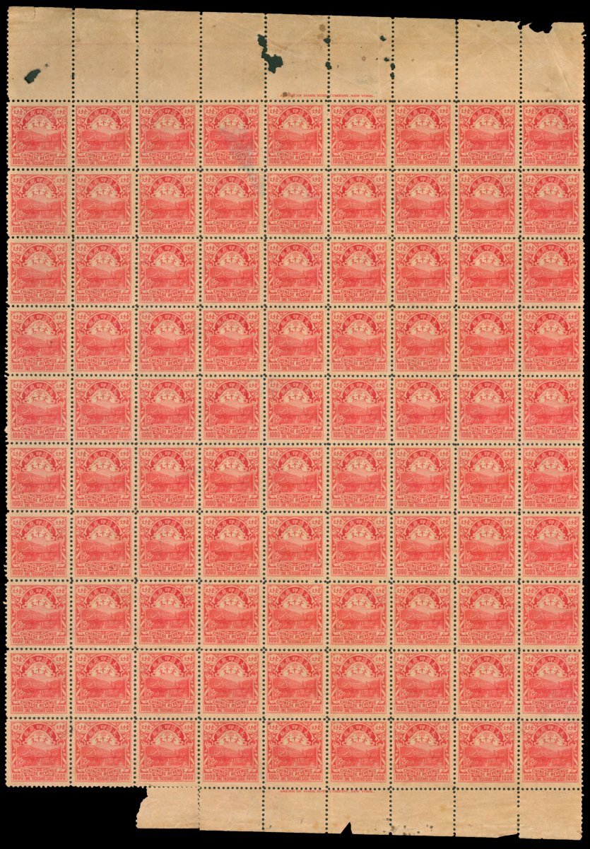 1908年紐約版大清印花稅票1000文新票100枚全張4件,局部有損,其中2版有粘連,中上品,請預覽