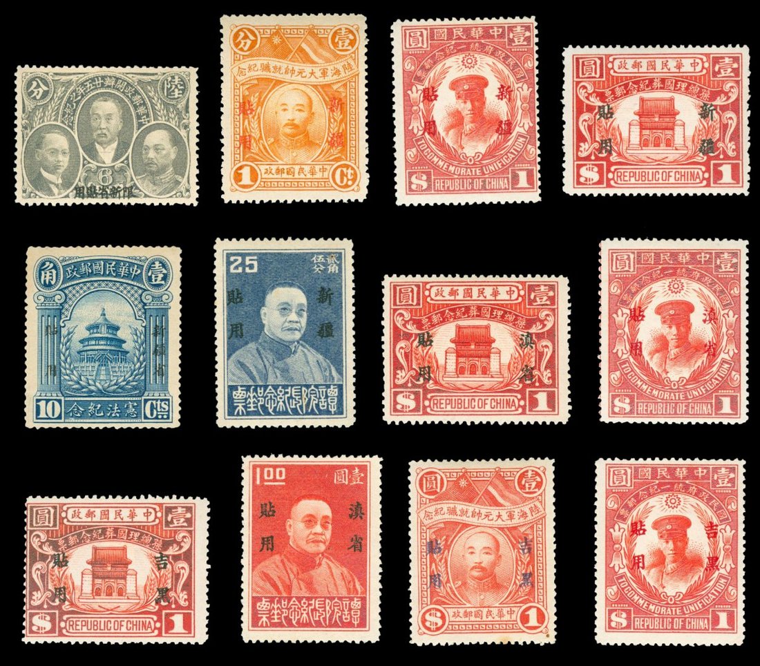 1921-33 a group of 12 sets of provincial Use commemorative issue including ovpt. "For Use in Yunnan Province" 1929 Unification, State Burial, 1933 Tan Yen-Kai; ovpt."For Use in Sinkiang" 1921 25th Anniv. of Postal Service, 1923 Consitution, 1928 Inauguration of Marshal,1929 Unification, State Burial, 1933 Tan Yen-Kai; ovpt. "For Use in Ki-Hei" 1928 Inauguration of Marshal, 1929 Unification, State Burial, fresh , hinged, one stamp (Chan PS81) damaged, few with thin and no gum. Chan PS39-46, 71-74, 79-82, 113-114, Y21-28, 52-55, KH21-32.