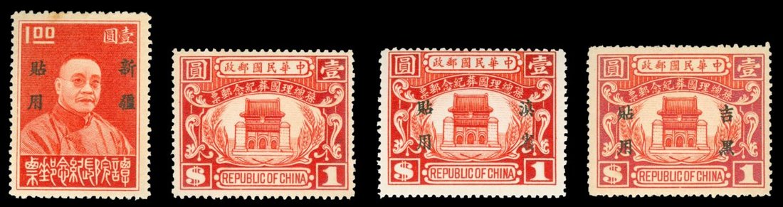 1929-33 a group of 6 complete sets commemorative issue including 1929 State Burial, State Burial ovpt. "For Use in Sinkiang", ovpt. "For Use in Ki-Hei", and ovpt. "For Use in Yunnan Province" (2) and 1933 Tan Yen-Kai ovpt. "For Use in Sinkiang", fresh, mint, hinged. Chan 301-304, PS79-82,113-116, KH25-28, Y25-28