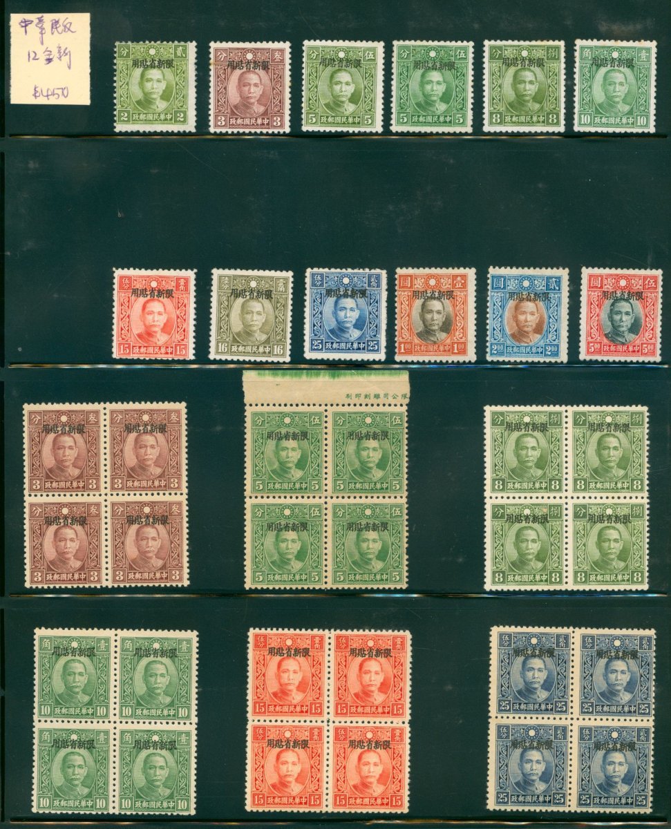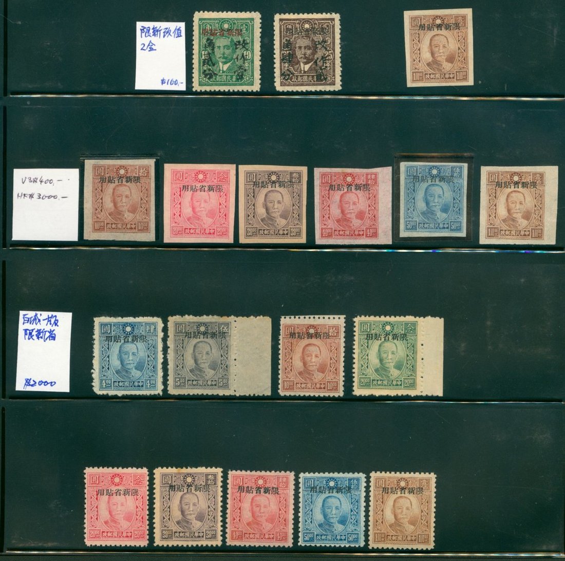 1933-42年孫像或烈士加蓋 "限新省貼用"票共190餘枚(含四方連票), 包括北平加蓋全套12枚, 1943年百城凹版孫像無齒票全套6 枚, 普港版烈士像全套14枚等等, 品相不一, 敬請預覽.
