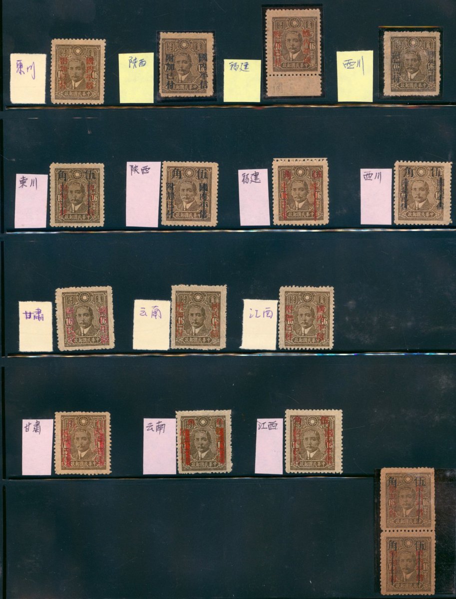 1942 a group of 39 overprinted "Surcharge of 50 Cents" and "Surcharge for Domestic Postage Paid"; includind Hunan, Hupeh, Honan and Kwangsi Thick bars. some stamps with margin.