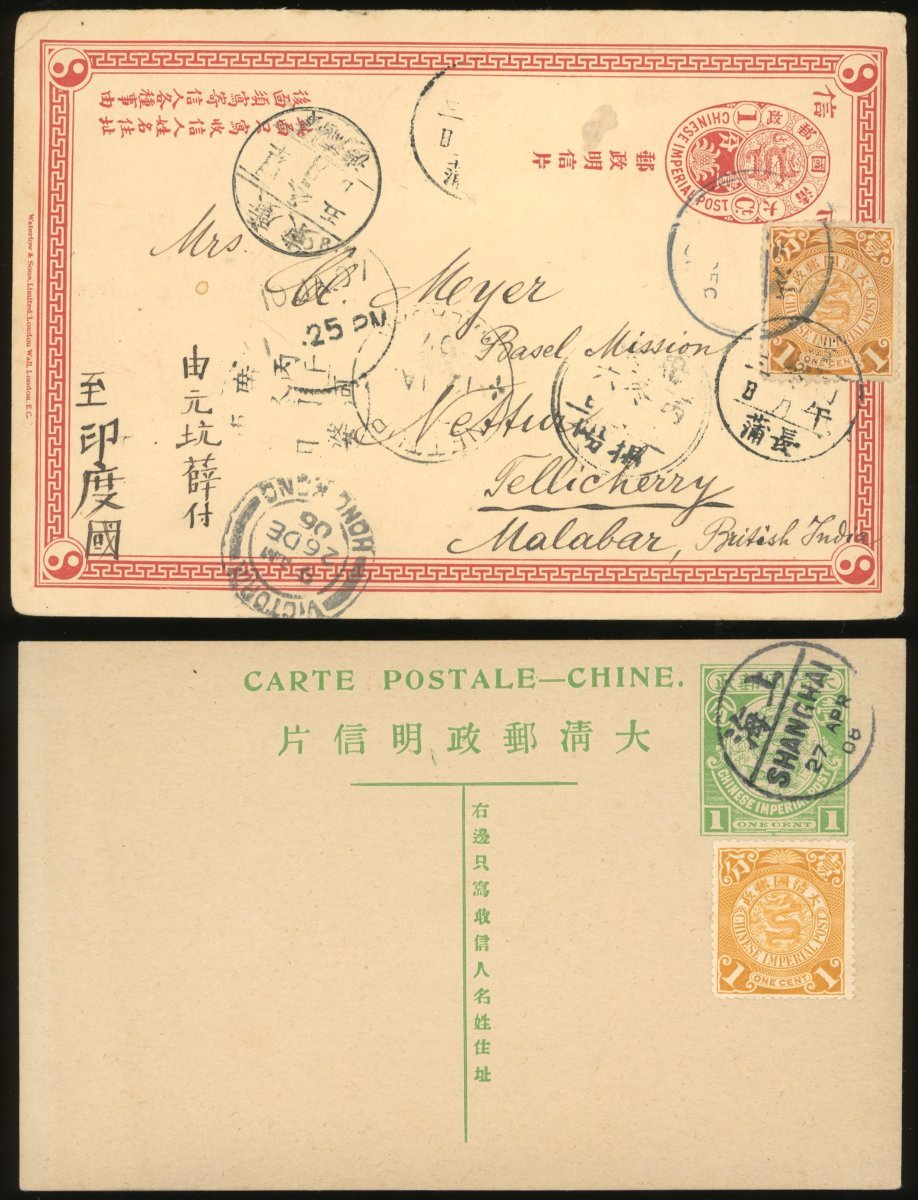 1905-24 postal stationery cards; 1) 1906 1c. reply card to British India cancelled by "Chongpo" lunar d.s. 2) 1908 1c. card cancelled by Shanghai c.d.s. uprated with C.I.P. 1c., 3) 1917 1c. card uprated with Junk 3c. cancelled by Kayingchow c.d.s. to Switerland, 4) 1917 1c. card to Namyung cancelled by Chihing, 5) 1922 1c. card to Hingning cancelled by Hokshiha, 6) 1926 1c. card to Muihsien. fine.