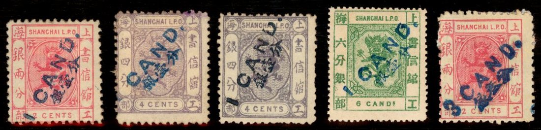 1873-77 Small Dragon surch. issues, with 1ca. on 2c., 1ca. on 4c. (2), 1ca. on 6ca. and 3ca. on 2c., fine, mixed condition. Please review.