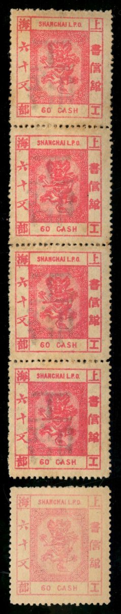 1888 Small Dragon, the fifth issue 60 cash; the sixth issue 60 cash in stripe of four, with no dot on top of character "Wen", mint, hinged with toned gum. Chan LS102a, 107a.