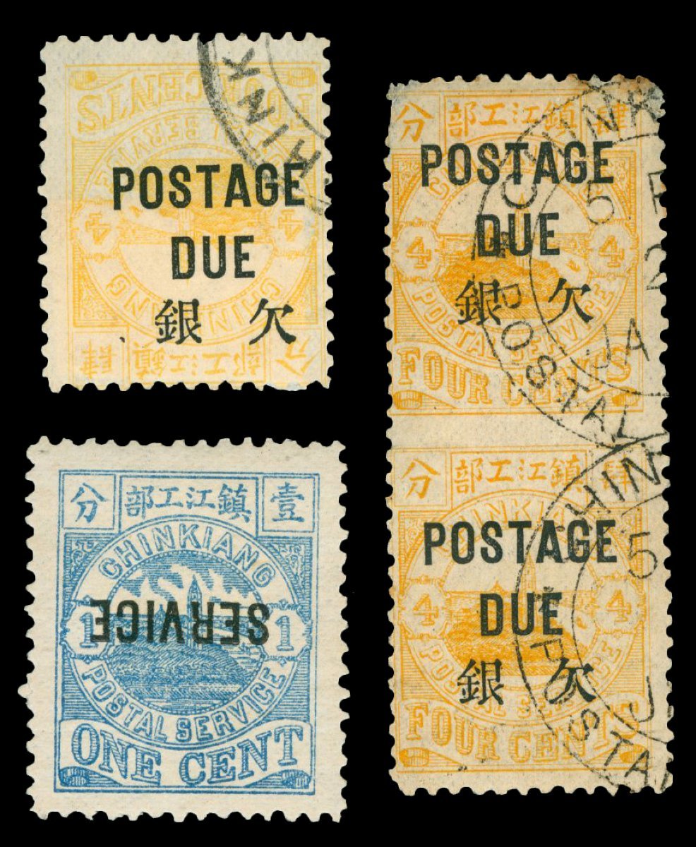 1894-95年鎮江書信館變體票3件,包括4分加蓋欠資倒蓋變體舊票1枚,4分加蓋欠資中縫漏齒直雙連舊票1件,10分加蓋公事倒蓋變體新票1枚,整體上中品