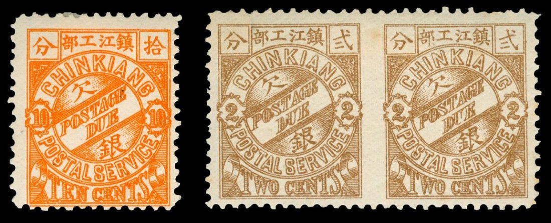 1895年鎮江書信館欠資新票半分至10分各一枚,另有2分中縫漏齒變體橫雙連新票1件,整體顏色鮮豔,原膠,上中品