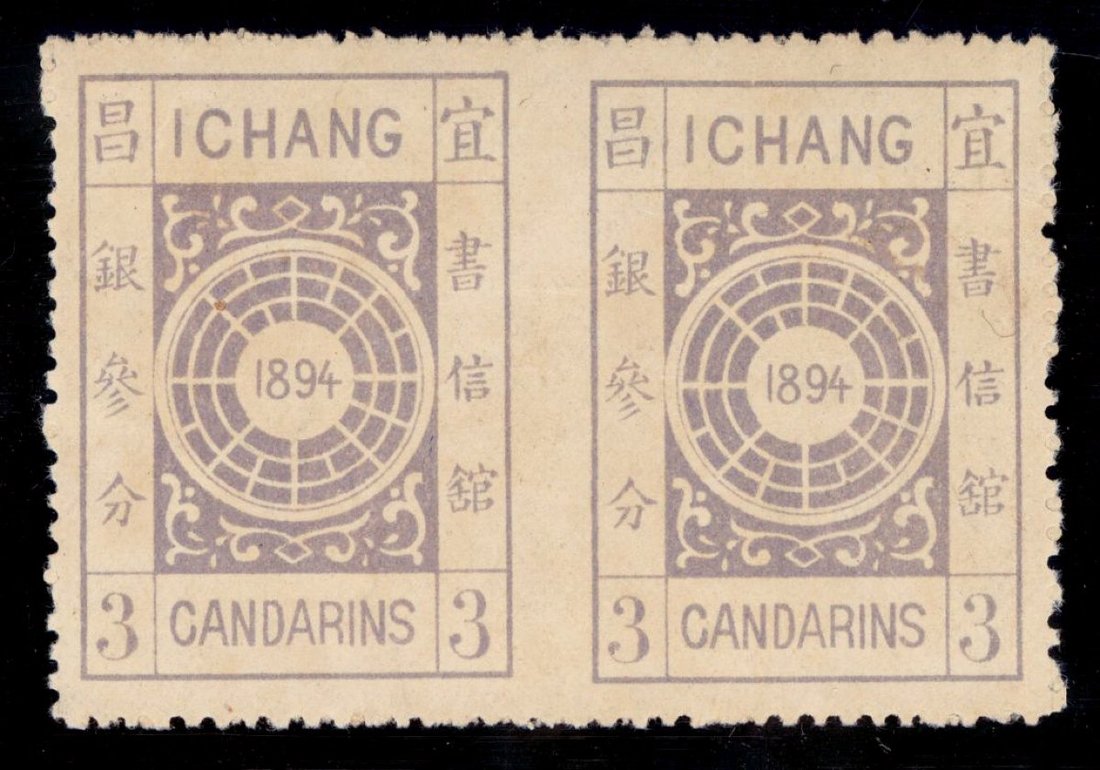 1895年宜昌書信館3分中縫漏齒變體橫雙連新票1件,顏色鮮豔,上中品