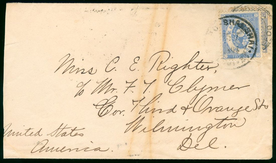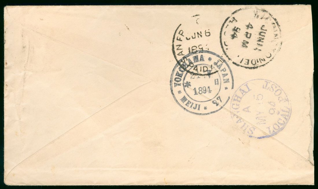 1894年煙臺寄美國實寄封1件,貼煙臺書信館2分1枚,銷煙臺書信館郵戳,經上海中轉,有上海5月15日工部小圓戳,上海日本客郵局加貼日本郵票5錢1枚,銷上海日本客郵局同日戳,再經日本橫濱,美國三藩市中轉,依次有橫濱21日戳,三藩市6月6日戳,及美國6月11日到達戳,郵路清晰,保存完好,少見