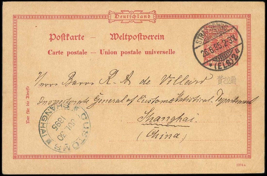 德國: 1895年6月26日德國10 pf. 郵資片寄上海, 銷Strassbury 日戳, 藍色7月30日上海海關戳, 片背蓋較模糊德國客郵戳 (可能是7月27日), 片有摺, 經由海關系統部郵遞的進口 郵資片.