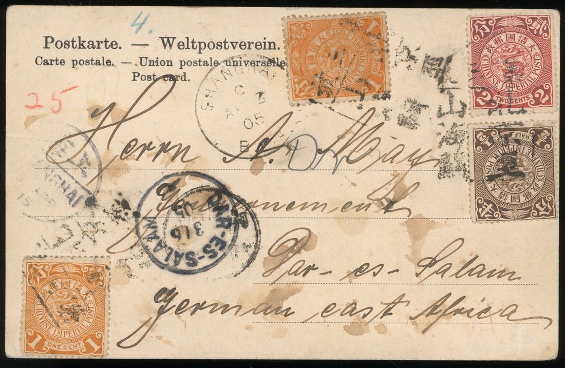 1905 (Apr.) postcard fromTsingwangtao to Dar-es-Salaam via Shanghai bearing C.I.P.franking 4?c. tied by large boxed Peking-Shanhaikwan No.3 train chop in black, with Shanghai bilingual transit c.d.s. and Shanghai B.P.O. c.d.s., Dar-es-Salaam arrival c.d.s. alongside. Very rare from China to Dar-Es-Salaam. Fine.