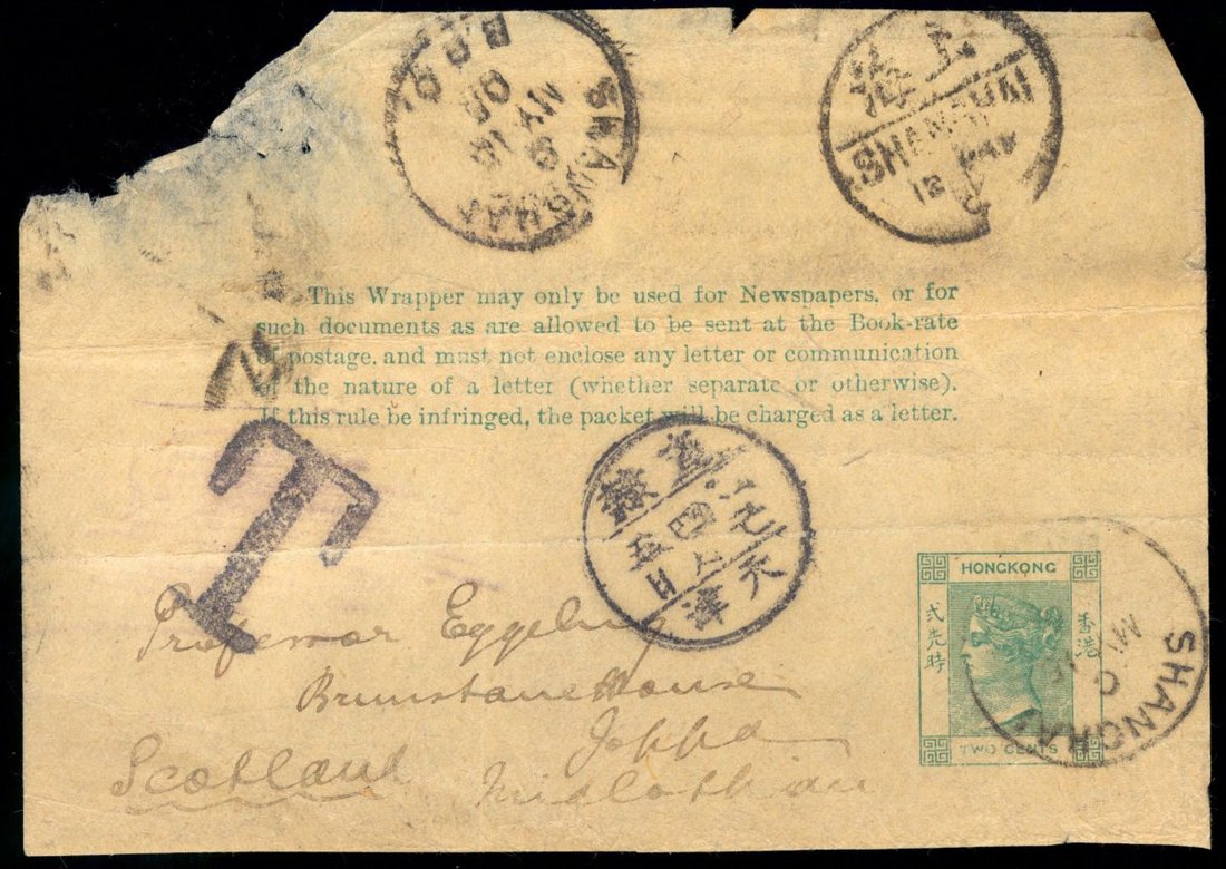 1905 (8 May) 2c. Hong Kong newspaper wrapper to Scotland, showing "Chihli / Tientsin" lunar c.d.s., and large "T" postage due h.s. in black, with Shanghai (12.5) and Shanghai B.P.O. (15.5) transit c.d.s.