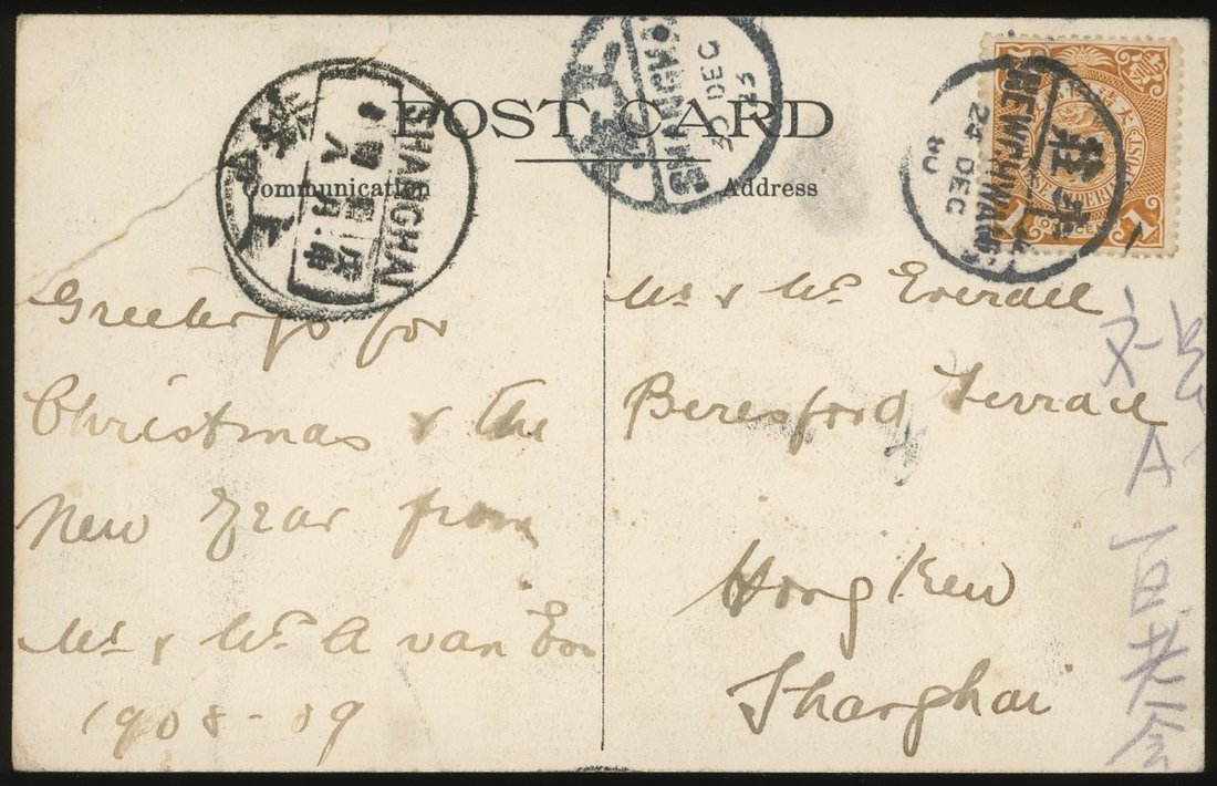 1905-08 from Newchwang postcard x 3: 1905 (15 July) to England, bearing C.I.P. 5c.; 1907 (3 Apr.) to Shanghai, bearing C.I.P. 1c.; 1908 (24 Dec.) to Shanghai, the year in c.d.s. "08" invert "80" variety. Rare.