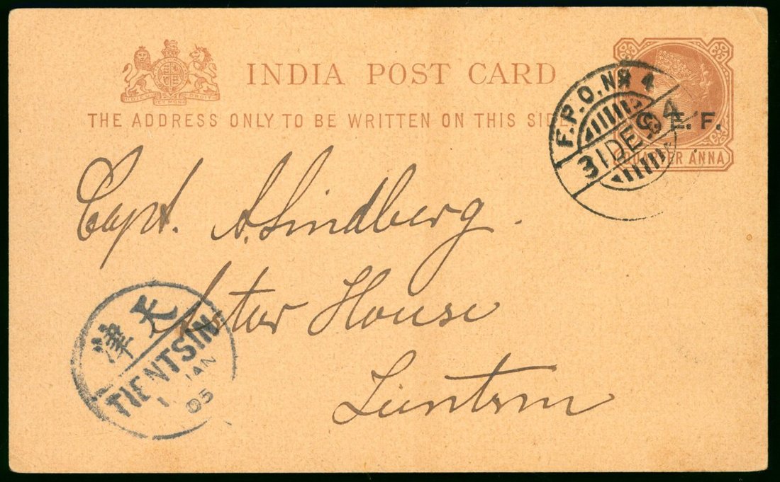 1905 (31 Dec.) India C.E.F. ovpt. ¼ a. card, adressed to Captain Hindberg of Tientsin, from Tangku to Tientsin, cancelled by "F.P.O. no.4" c.d.s. , with next day arrival c.d.s.,