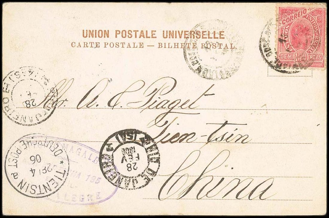 Brazil: 1905-06 two picture post cards to Tientsin bearing 10c. franking tied by the despatch c.d.s., the first sent through the French Post Office with Shanghai and Tientsin c.d.s., the second through the German Post Office with Tientsin arrival c.d.s. A good pair of cards