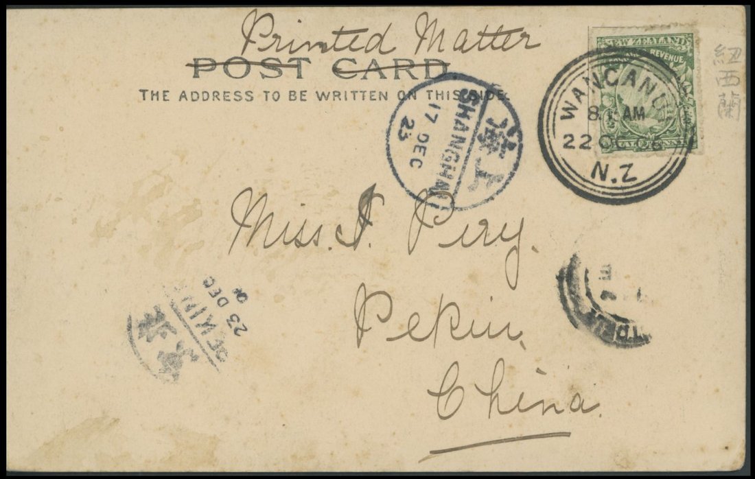 New Zealand: 1906 (22 Oct.) picture post card to Peking bearing ?d. tied by Wanganui c.d.s. with part Victoria c.d.s., Shanghai (17.12) and Peking (23.12) bilingual c.d.s.
