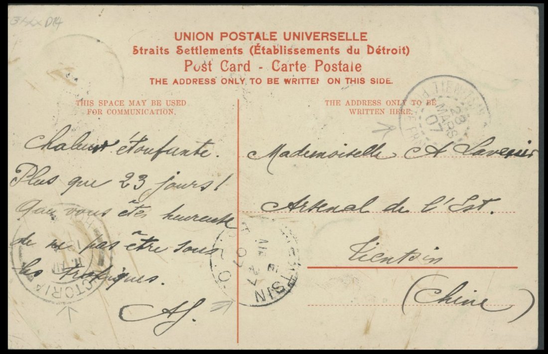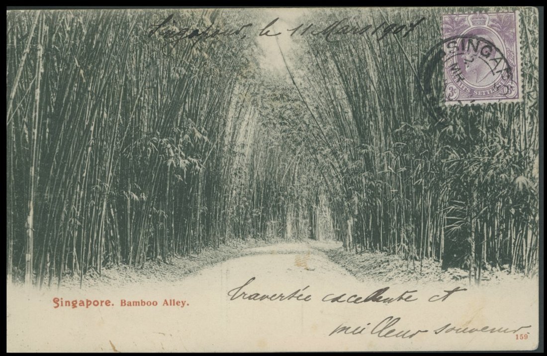 Straits Settlements: 1907 (11 Mar.) picture post card to Tientsin bearing, on the picture side, 3c. tied by Singapore c.d.s., the address side with Victoria, Hong Kong (18.3), B.P.O. Tientsin type B c.d.s. (27.3) and French P.O. Tientsin (28.3) c.d.s. Fine and an unusual combination of British and French postmarks
