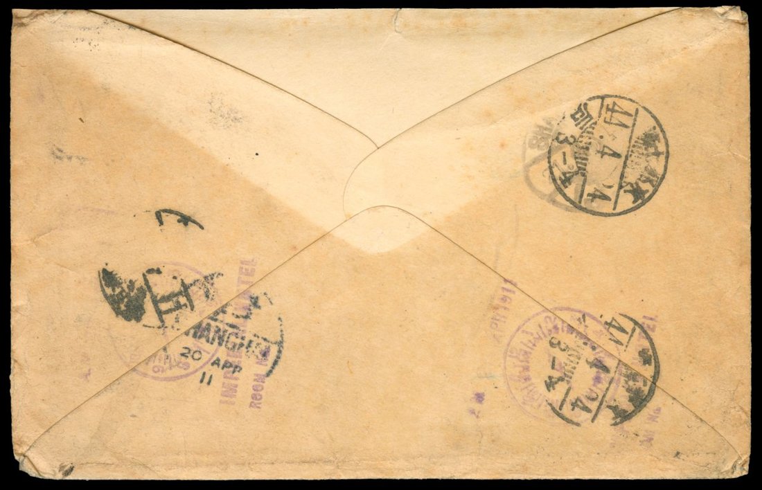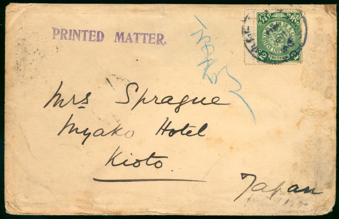 1911 (22 Mar.) printed matter envelope to Japan bearing C.I.P. 2c, cancelled by Shanghai bilingual c.d.s., showing on reverse Shanghai (20.4) transit c.d.s. and Kyoto arrival c.d.s. (24.4).