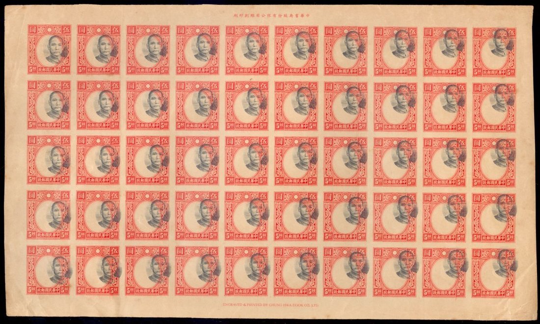 1938 Hong Kong Chung Hwa Print Dr.Sun Issue, block of 50, , Imperf. $5 avatar shift variety.
