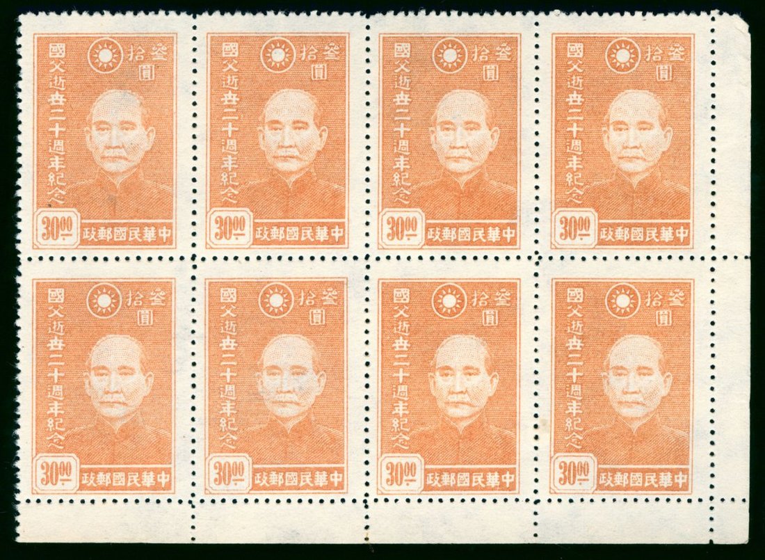 1945年孫中山逝世二十周年紀念新票八方連1套,均帶右下直角邊紙,紙質白淨,票面顏色鮮豔,上中品