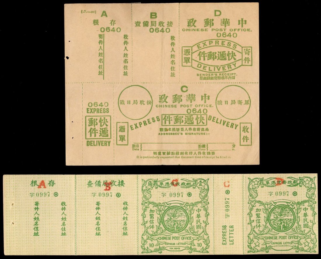 1914年2月民國快信郵票兩件; 包括1914年第二次發行票兩件(加蓋"薑山鎮"及"濮院"), 1916年第二次發行加蓋"A,B,C,D"字樣三件, 及1920年快信郵票一件. 共六件, 均全新未用.