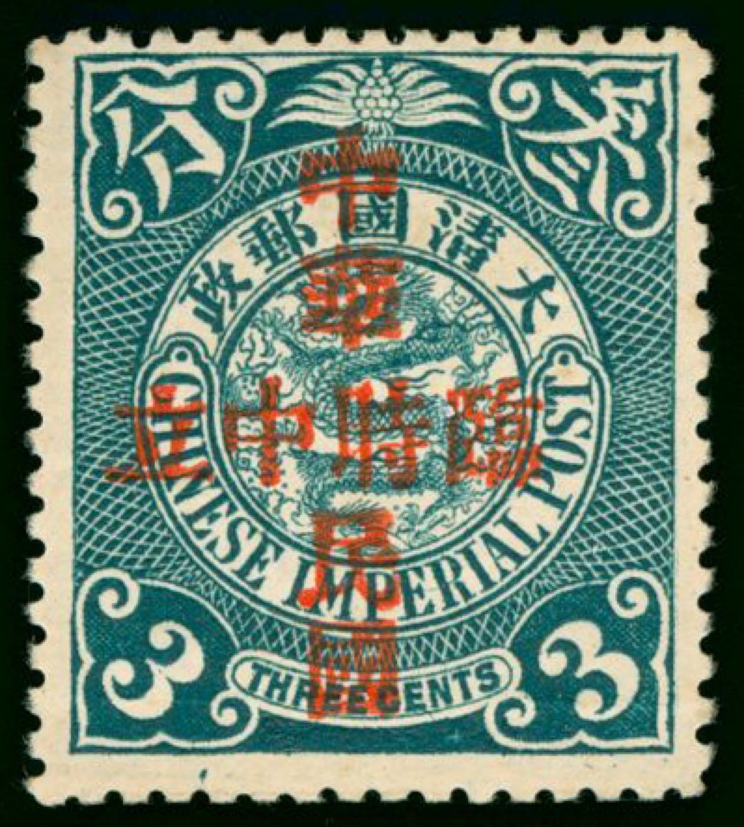 1912年倫敦版蟠龍加蓋中華民國臨時中立3分新票1枚,票面顏色鮮豔,齒孔完整,原膠輕貼,上中品