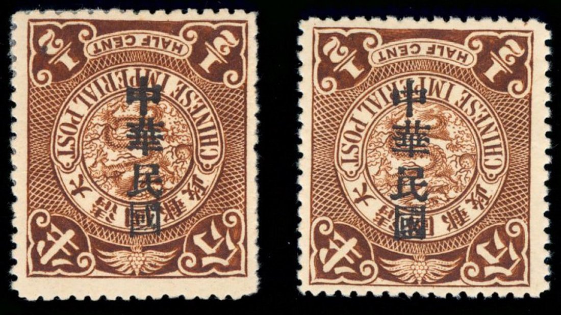 1912年倫敦版蟠龍加蓋宋體中華民國半分新票2枚,均倒蓋變體,票面顏色鮮豔,齒孔完整,原膠未貼,上中品