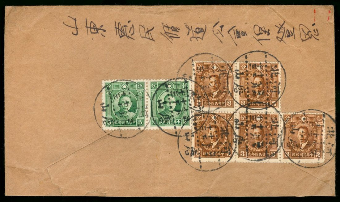 1935 (15 Jul.) envelope to England bearing on reverse First London Print 5c. (2), Martyrs 3c. (5) cancelled by Tangshan c.d.s.