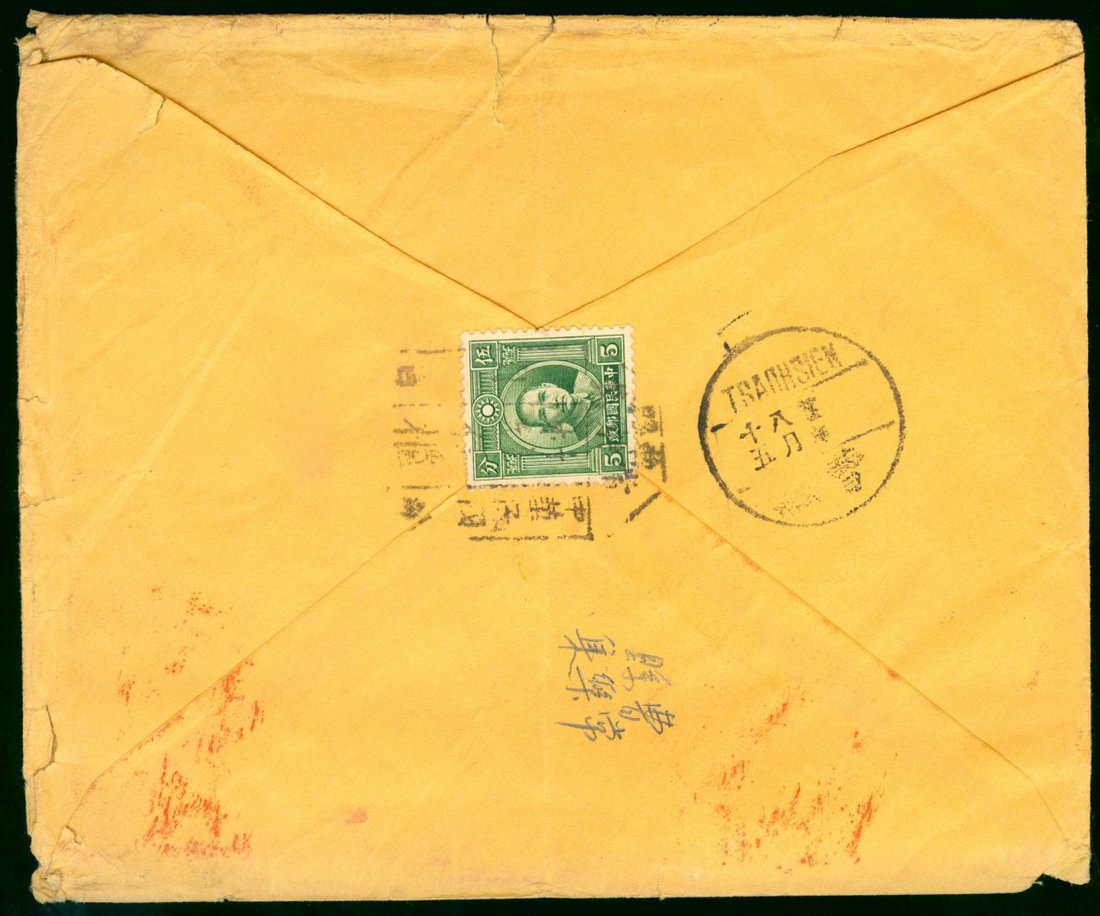 1935 (15 Aug.) Printed matter envelope to Chicago, bearing on reverse First London Print 5c. cancelled by Tsaohsien Shantung Village mailbox tombstone h.s. in black, with Tsaohsien c.d.s alongside.