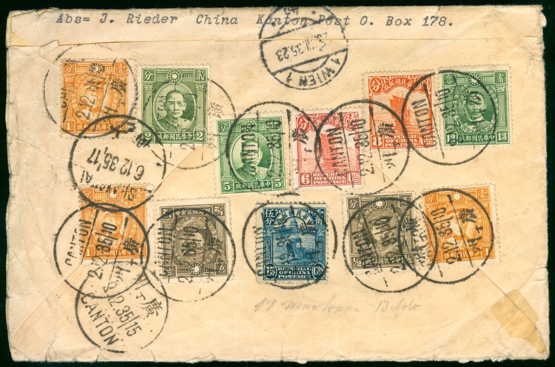 1935 (2 Dec.) registered envelope to Austria bearing on reverse Junk 6c., 8c., 15c., First London Print 2c., 5c., Martyrs ½c. (2). 1c. (3), 13c. cancelled by Canton bilingual c.d.s., with Shanghai (6.12) transit c.d.s adjacent and arrival c.d.s. (25.12).