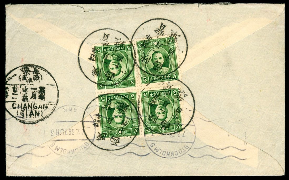1936年陝西寶雞寄瑞典實寄封1件,貼倫敦一版孫像5分4枚,銷陝西寶雞1月14日戳,經西安中轉有15日中轉戳,及瑞典2月7日機蓋到達戳,郵戳清晰,保存完好