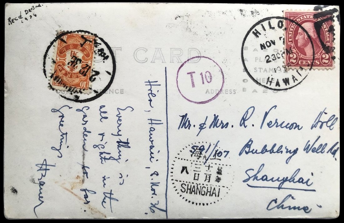1936 (7 Nov.) post card from Hawaii to Shanghai (3.12) bearing U.S.A. 2c. cancelled by Hawaii c.d.s., showing "T10" postage due h.s. in violet, with Postage Due 10c, applied on arrival cancelled by Shanghai c.d.s. (2.12) and arrival c.d.s. alongside.