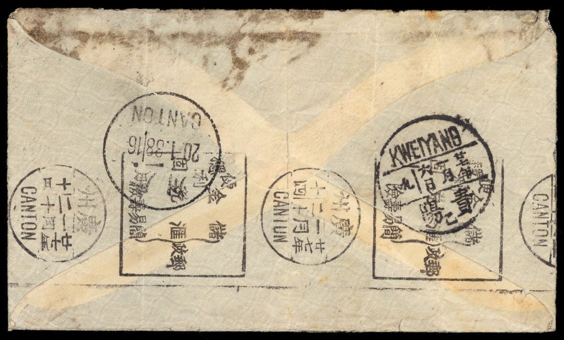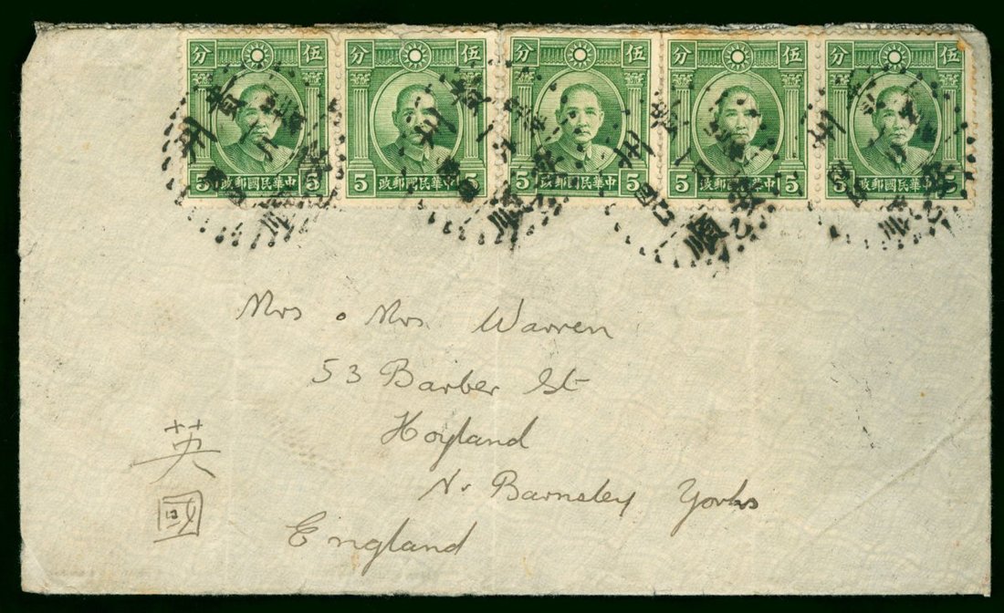 1938 (4 Jan.) envelope to England bearing First London Print 5c. (5) cancelled by Aushun c.d.s., showing on reverse Kweiyang (6.1), Canton (20.1) transit c.d.s. and Canton machine d.s.