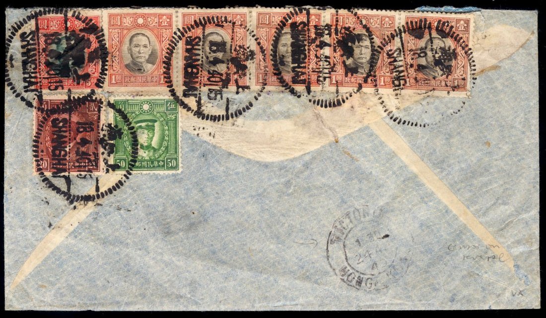 1940 (18 Apr.) airmail envelope to South Africa bearing on reverse Dr S.Y.S. $1 (5). $5, Martyrs 20c. and 50c. cancelled by Shanghai dotted rim c.d.s., showing Hong Kong (24.4) transit c.d.s. with "PASSED/CENSOR" triangular h.s. in violet.