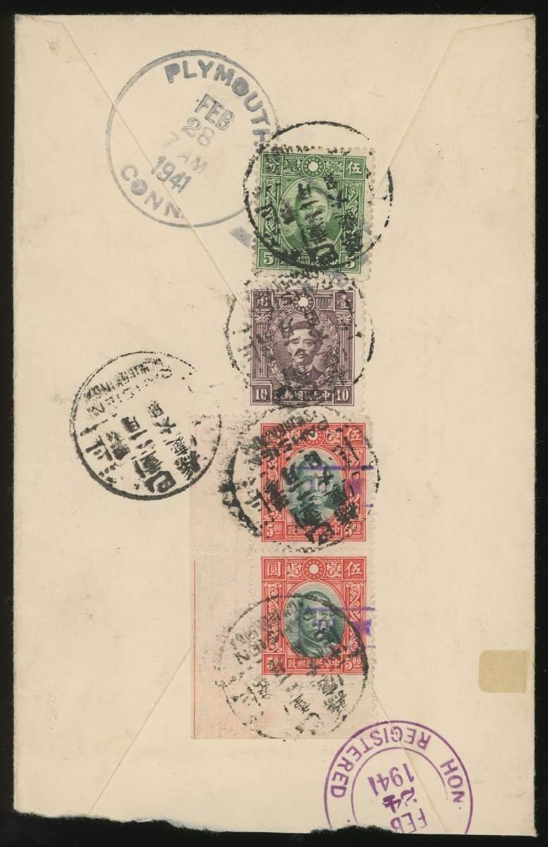 1941 (6 Feb.) to U.S.A. registered air mail cover, on the reverse, bearing franking $10.15 tied by Chungking c.d.s., transit by Honolulu (24.2) and arrival Plymouth (28.2). Fine.