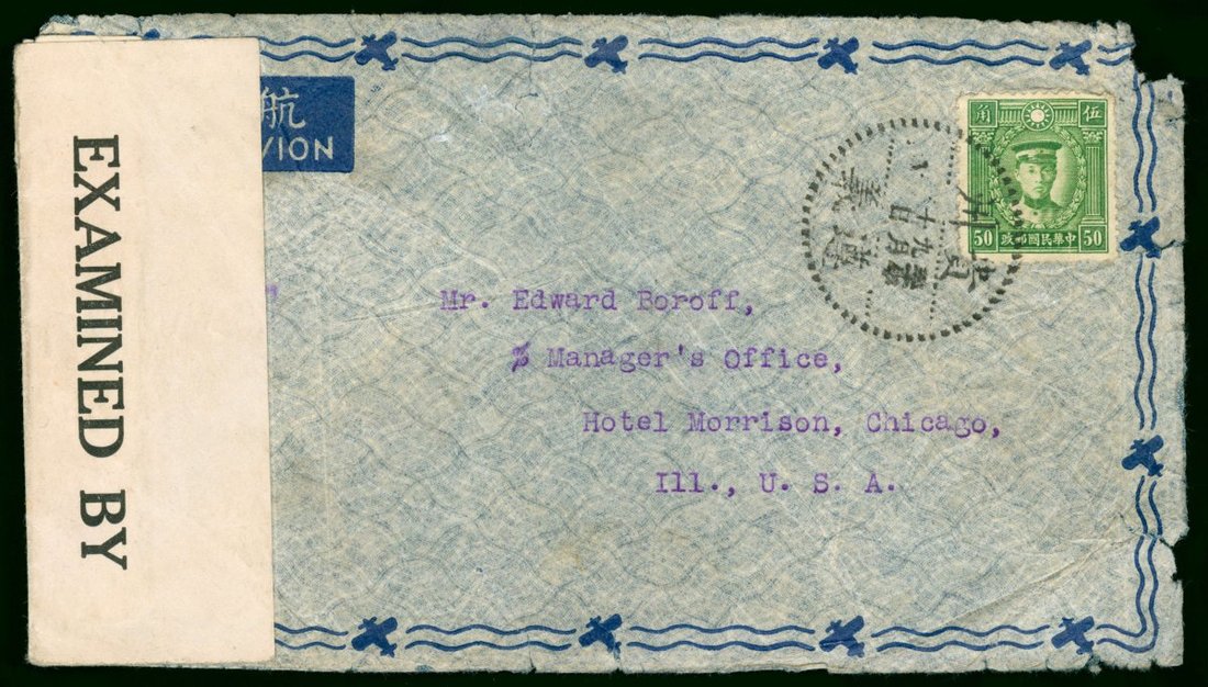 1941 (10 Sep.) airmail envelope to U.S.A. bearing Martyrs 50c. cancelled by Tsunyi c.d.s., with Kunming (16.9) transit c.d.s.. Burma and U.S.A. censor seal.