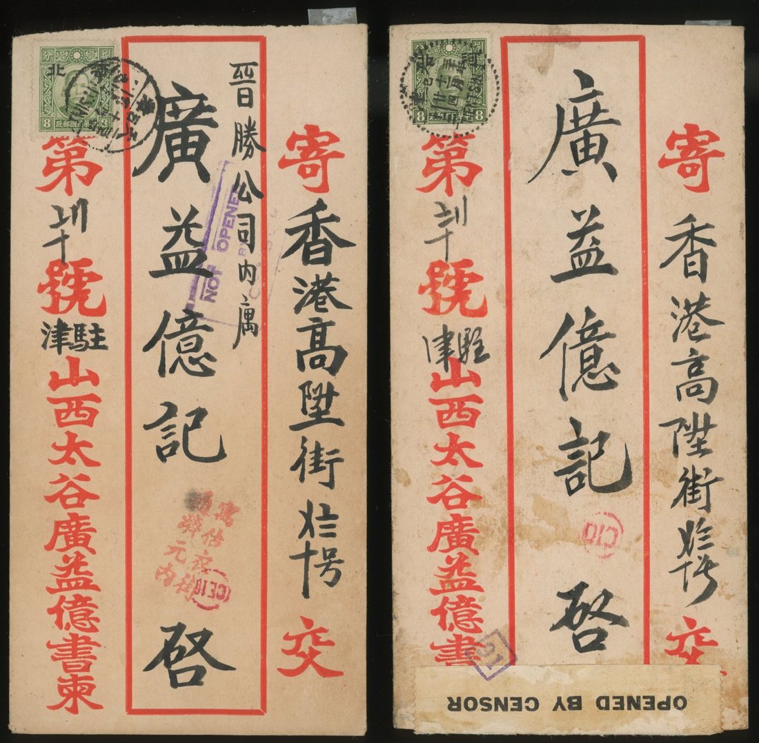 1941年天津同一寄信人寄香港相同地址實寄封2件,分別貼香港中華改版孫像及香港大東版孫像8分加蓋河北大字1枚,銷10月日戳及11月24日戳,其中10月封蓋香港未拆封檢查戳,而11月封經重封檢查貼重封條,均保存完好,由此兩件實寄封可看出香港兩種檢查處理辦法之變化,非常難得