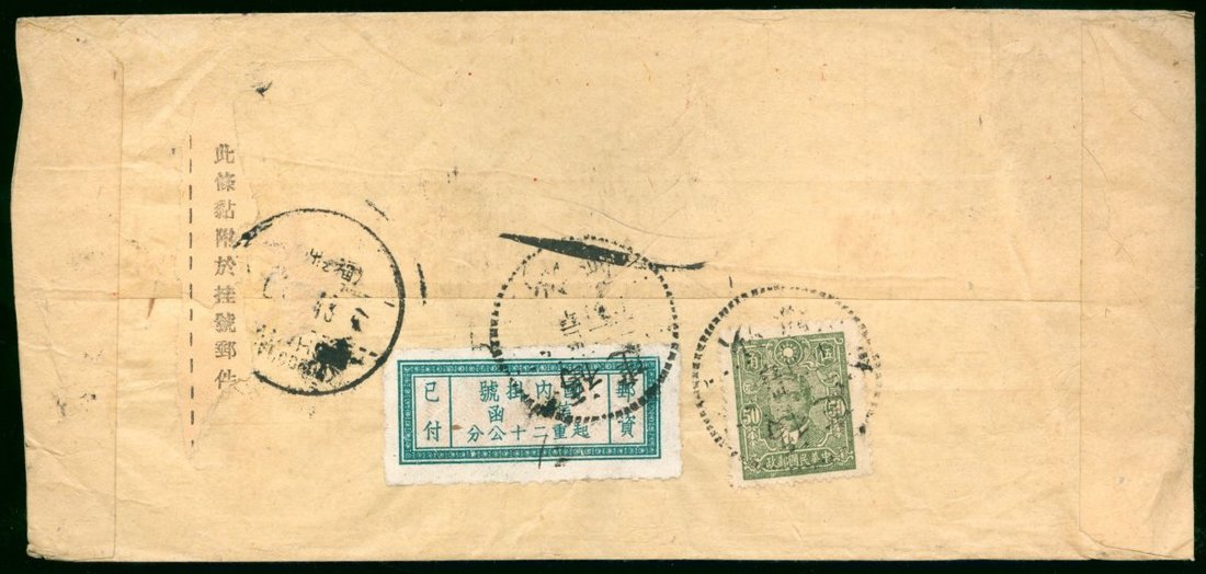 1943年福建沙縣寄福州掛號封1件,貼中信版孫像50分1枚,國內掛號信函郵資已付單位票1枚,銷福建沙縣2月2日戳,有福州6日到達戳,封背有掛號殘條,保存完好