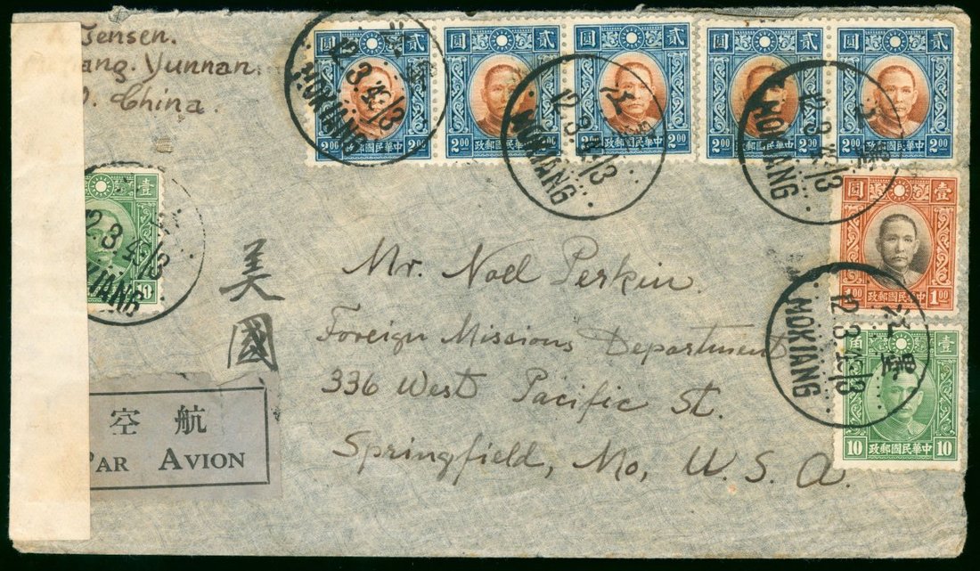 1943年雲南墨江寄美國航空封1件,貼港版孫像10分2枚,1元1枚,2元5枚,銷墨江3月12日戳,有昆明5月20日中轉戳,郵件經檢查,貼重封條,保存完好