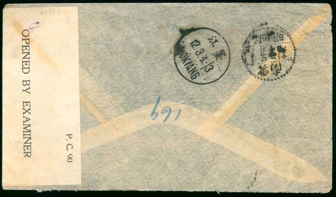 1943 (12 Mar.) censored airmail envelope from Mokiang in Yunnan to U.S.A. paying total $11.2 rate, with Yunnan (20.3) transit c.d.s. on reverse.
