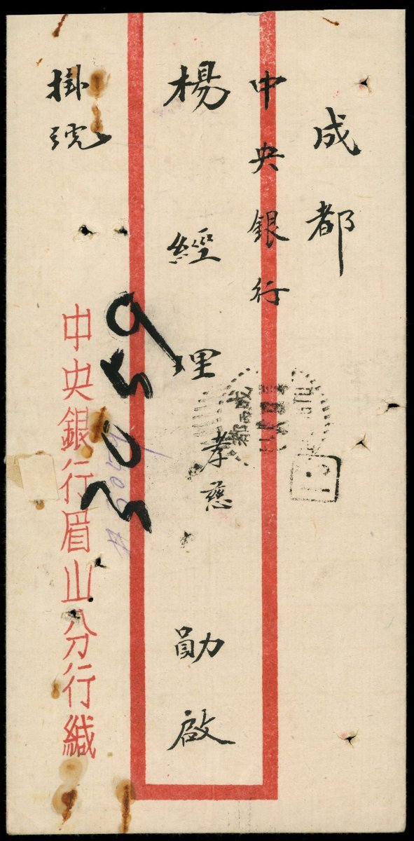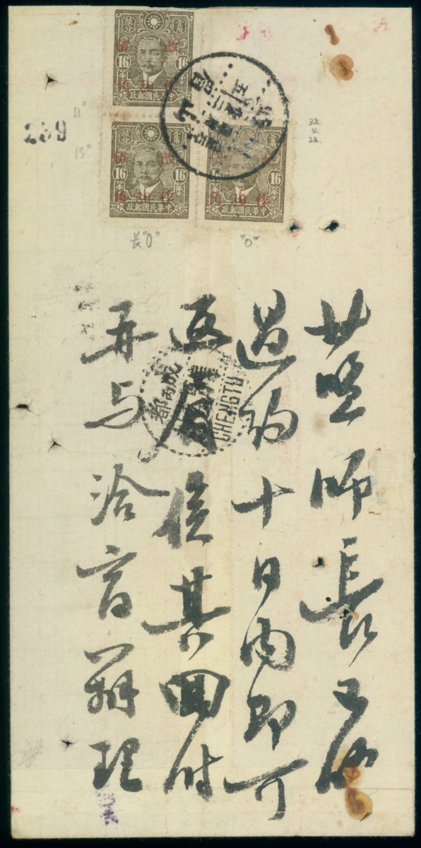 1943 (23 Apr.) a registered envelope to Chengtu bearing West Szechwan 50c. on 16c. (3) tied by Meishan c.d.s. one stamp trimmed, cover has few holes, Chengtu (26.4) arrival c.d.s.