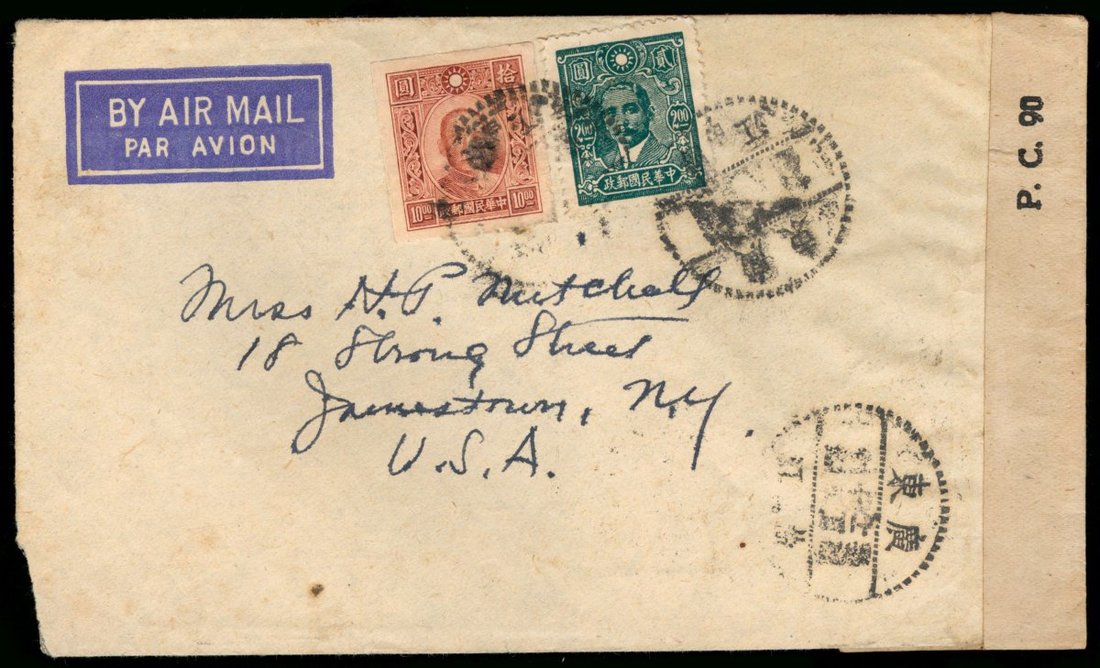 1943 (15 Dec.) airmail envelope to U.S.A. from Lingnan University, bearing Central Trust Print $2, Paicheng Print $10 cancelled by Kukiang c,d,s,, showing Chungking (25.12) transit c.d.s om reverse, with censor label and seal. Lingnan university was forced to move several times during 1930s to 40s when the Japanese occupied Canton and Hong Kong.