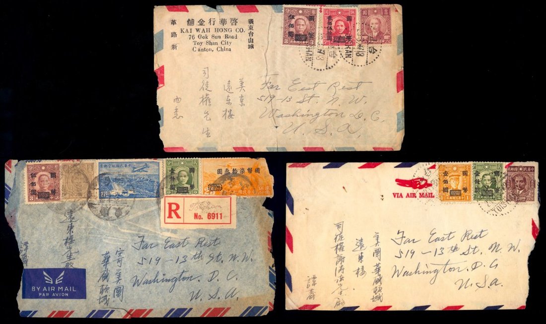 1946-48 a group of three covers from Toishan, Canton to U.S.A., with different franking.