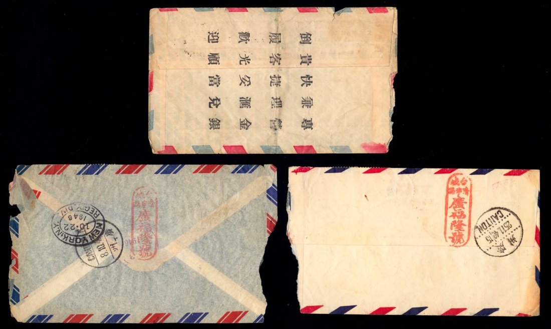 1946-47廣東臺山寄美國廣府僑批航空封3件,分別銷各版孫像國幣郵票,銷不同戳式臺山日戳,分別蓋僑批局章,或使用僑批局公函封,保存完好