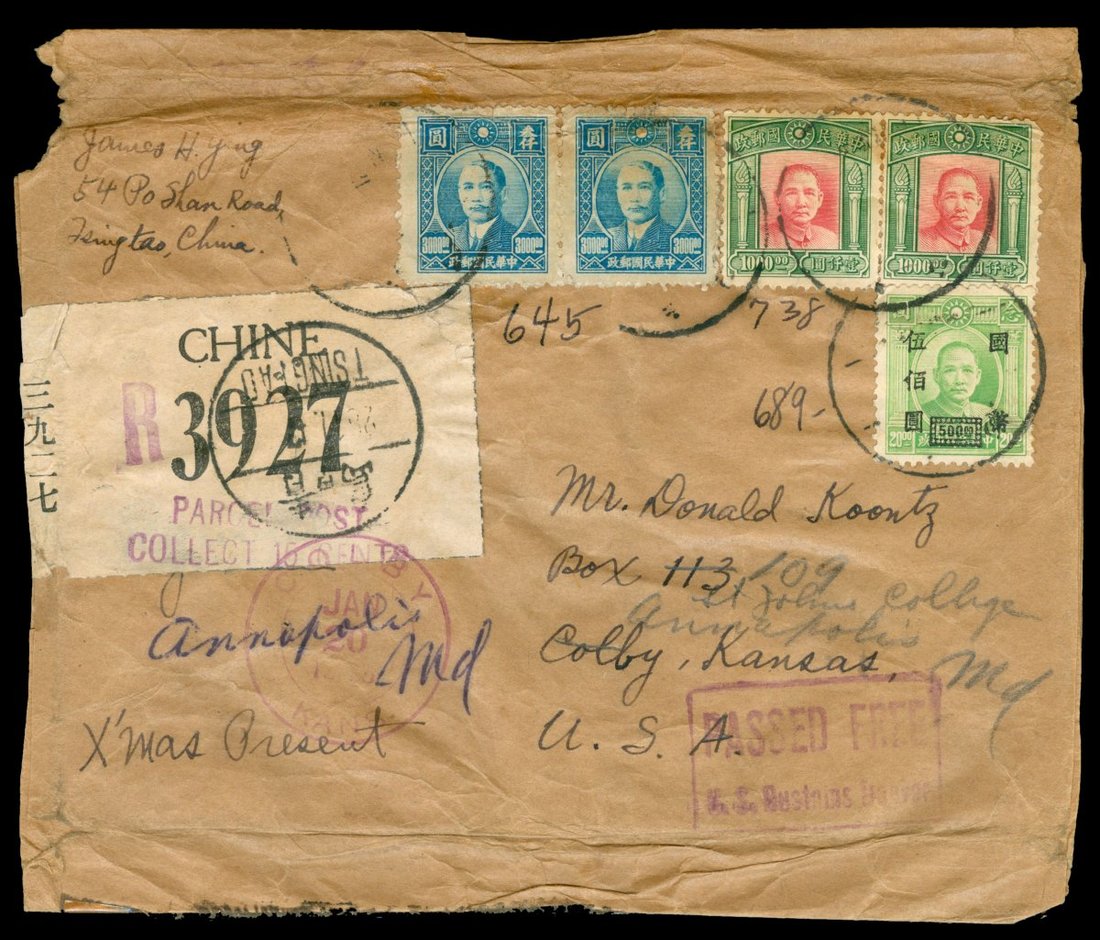 1947 (28 Nov.) envelope to U.S.A. bearing 1946 First Shanghai Dah Tung Print $3000 (5), $5000 (8), Fourth London Print $1000 (3) and C.N.C. surch. $500 on $20, cancelled by Tsingtao c.d.s., endorsed "X'mas Greeting", with registration label, showing "Passed Free/U.S. Customs …" and "Parcel Post/Collect 15 cents" h.s., both in violet, with next year "Colby/Kans" arrival c.d.s. (20.1) adjacent
