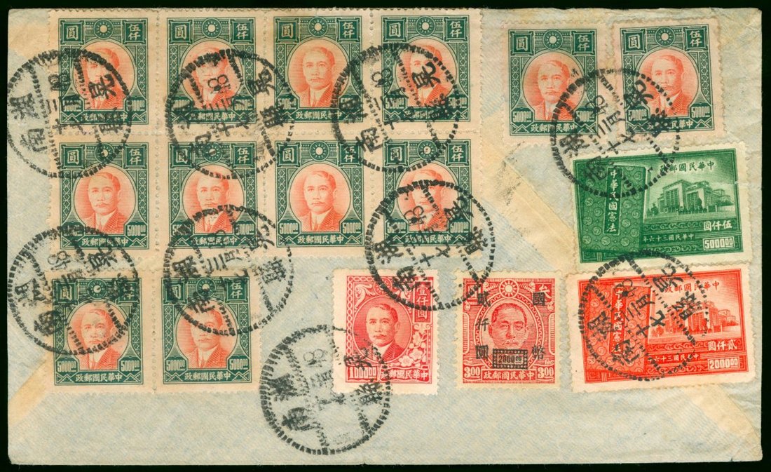 1948 (17 Mar.) airmail envelope to U.S.A. bearing on reverse Consitution Commemorative $2000, $5000, First Dah Tung Print $5000 (12), Second Dah Tung Print $1000 and C.N.C. surch. $2000, cancelled by Huanghsien dotted rim c.d.s.