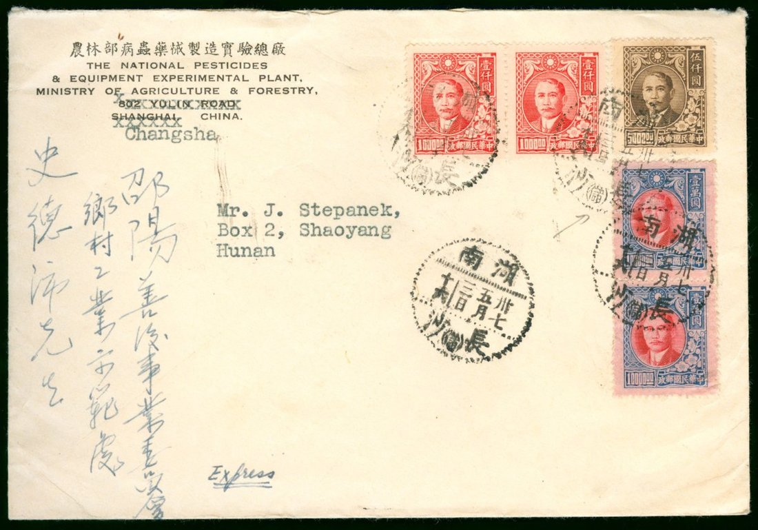 1948 (5 May) registered envelope to Shaoyang bearing Second Shanghai Dah Tung Print $1000 (2), $5000, $10000 (2) cancelled by Changsha with chinese word "Chu" c.d.s., showing same day arrival c.d.s..