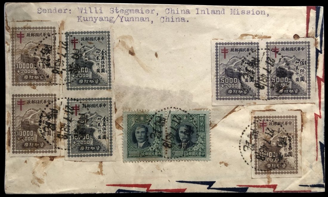 1948 (27 Jul.) airmail envelope to U.S.A. bearing Shanghai Dah Tung Second Print $50000 (2), Tuberculosis Relief $5000, $10000 (3), $15000 (2) cancelled by Kunyang c.d.s.