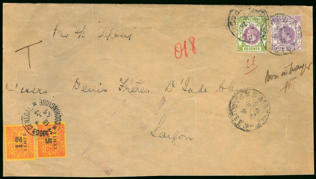 1936 (16 Dec.) Front piece of envelope from Hong Kong to Saigon (16.12) bearing K.G.V. 5c. and 20c. cancelled by Saigon Paquebot c.d.s., showing very light "PAYE" unframed h.s. in violet, Postage due 6c. and 12c. applied on arrival cancelled by "Saigon Central/ Cochinchine" c.d.s.