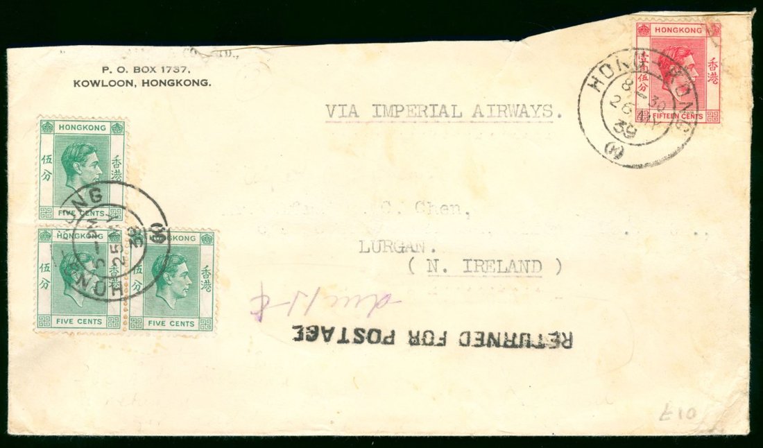 1939 (30 Aug.) envelope from Hong Kong to Ireland paying 15c. rate at first, showing unframed "Return For Postage" h.s. in black, payment further 15c. A good pre-war marking, envelope trimmed at top.