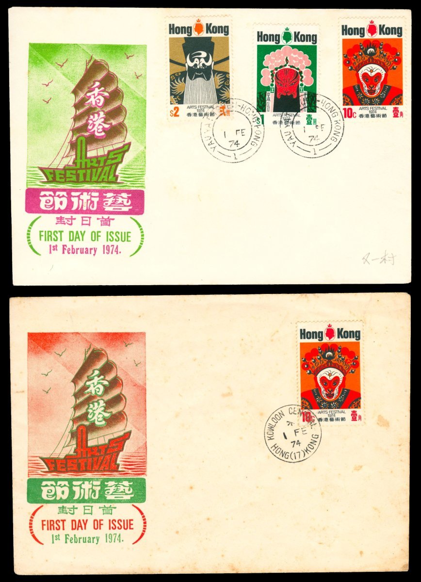 1974 (1 Feb.) two different colour of F.D.C. of Arts Festival of Hong Kong. Tied by Kowloon Central and Yau Yat Tsuen first day c.d.s. on each cover. One cover just with 10c. stamp.